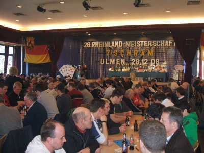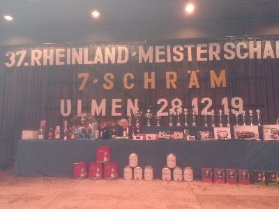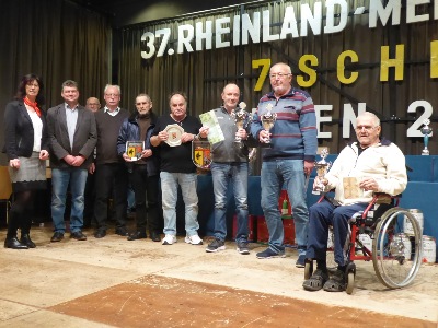 Der neue Rheinlandmeister mit Siegerpokal sowie v.l.n.r.: Turnierleiter Erich Michels, Helmut Dohr Sparkasse Mittelmosel Stadtbürgermeister Thomas Kerpen, Beigeordneter der VG-Ulmen Karl-Josef Fischer