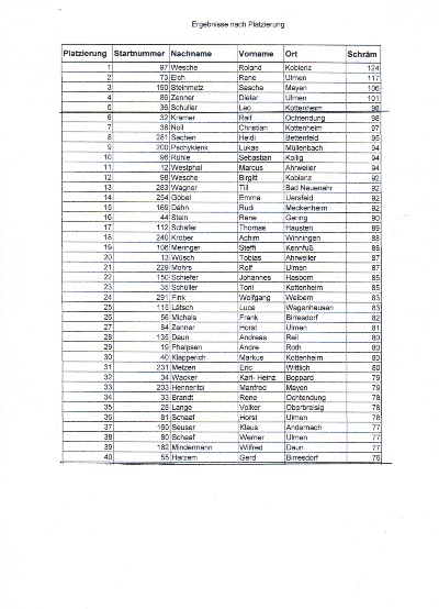 Einzelwertung Schräm: 1. André Retterath, Mendig 129 2. Jürgen Dung, Bad Neuenahr 113 3. Christoph Schmitz, Ochtendung 113 4. Elmar Konrad, Niederöfflingen 112 5. Christian Noll, Kottenheim 110 6. Felix Leo, Wittlich 108 7. Dominique Jung, Beuren 100 8. Arno Heiliger, Effelsberg 100 9. Alfred Schneider, Büchel 98 10. Kai Müller, Ettringen 97 11. Toni Schüller, Kottenheim 96 12. Michael Harsche, Bad Breisig 96 13. Dr. Alois Pitzen, Ulmen 95 14. Christof Hoß, Koblenz 94 15. Stefan Hoffmann, Kottenheim 91 16. Horst Rodemund, Niederöfflingen 91 17. Christian Max, Kennfus 91 18. Jörn Stadtmüller, Weißenthurm 90 19. Tim Krämer, Büchel 90 20. Volker Lange, Oberbreisig 86 21. Simon Adams, Mayen 86 22. Alexander Lenzenhuber, Faid 85 23. Holger Esper, UImen 85 24. Marko Lanser, Mayen 84 25. Norbert Kettenhofen, Düsseldorf 84 26. Richard Stocker, Bad Neuenahr 84 27. Hans Hüsch, Flußbach 83 28. Jürgen Mittler, Mendig 82 29. Rolf Mohrs, Ulmen 82 30. Stefan Oster-Daum, Wirfus 81 31. Niklas Benz, Büchel 79 32. Achim Kröber, Winningen 79 33. Herbert Hilger, Thür 77 34. Leo Kordel, Demerath 77 35. Marco Rehnelt, Kalenborn 77 36. Jonas Theisen, Wirfus 77 37. Marius Meurer, Ulmen 77 38. Rudi Dehn, Meckenheim 77 39. Marius Rink, Wirfus 76 40. Emma Göbel, Uersfeld 76